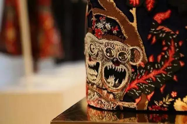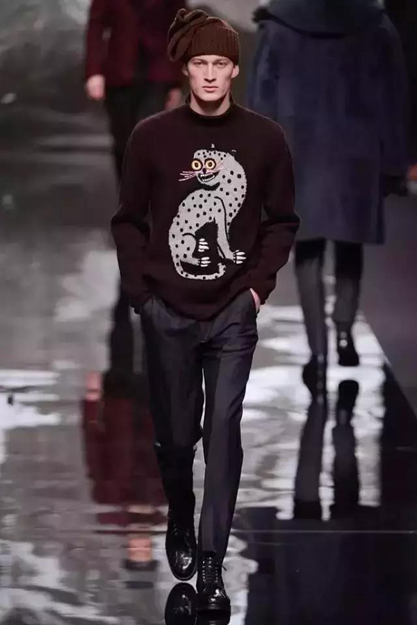 这些面目狰狞的野兽,像是刚听完David Bowie的演唱会,张牙舞爪、狂躁兴奋。在这次的回家之旅中,还有老友叙旧的环节。这些疯狂动物图案的原创者是Kim Jones的老友兼艺术家Jake和Dinos Chapman兄弟二人。早在2013年秋冬三人一起玩过一组充满戏虐感的喜马拉雅大眼睛系列,包括雪豹、猴子等图案让人记忆深刻。