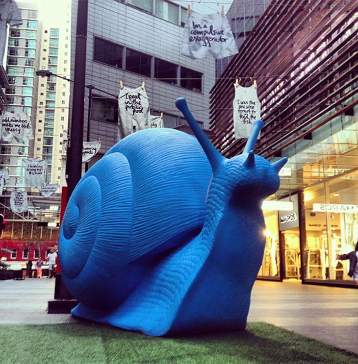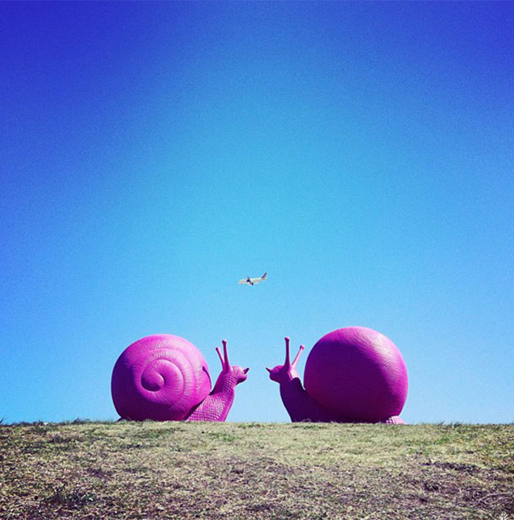 继去年入侵了义大利的米兰大教堂之后,巨型蜗牛军团“Snailovation”终于缓慢地来到了下一个目的地——悉尼。为庆祝悉尼年度公共艺术节Art & About Sydney,由6位艺术家组成的团队Cracking Art Group在海德公园、Pitt Street购物中心、马丁广场等地放置了24只采用可回收物料制成、如猛犸象般巨型的蜗牛雕塑来增添这座城市的艺术气氛。抢眼的萤光色泽加上巨无霸的身段,成为了悉尼今期最耀眼的风光。这两只体型庞大的蜗牛被命名为Snailovation,内装24色霓虹灯,重达100多公斤,它们将作为公共艺术品在悉尼CBD闪亮登场。