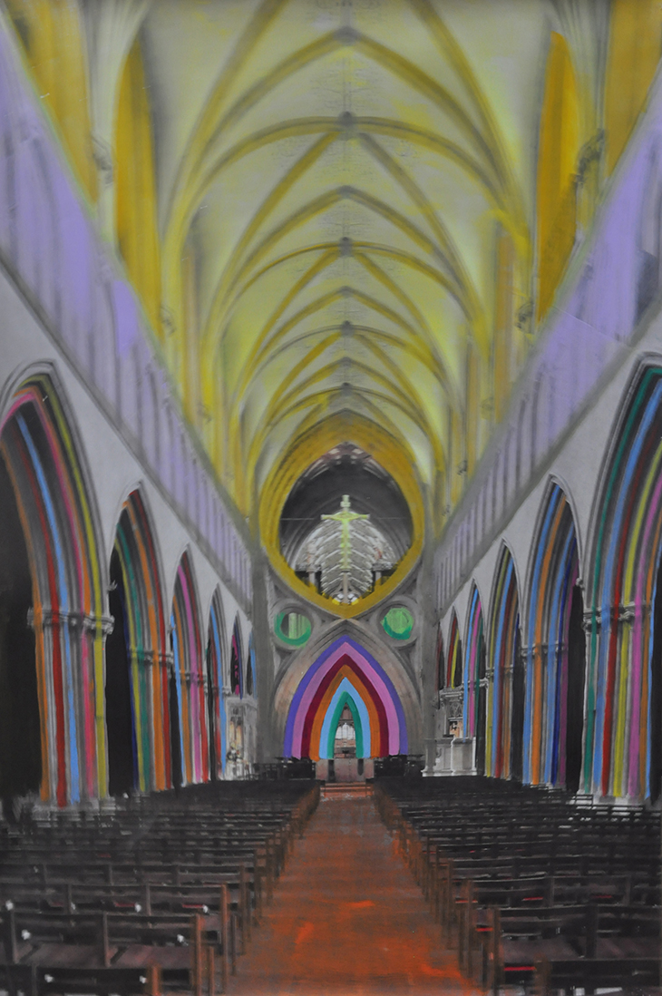 《寻找天堂之路》教堂是人们的精神居所,对于教徒来说教堂是圣地,他们通过这里寻找和认识上帝。由于我本身是平教徒,对于教堂系统的反思便越发地频繁。因此利用“方格”的思路套用在教堂上,发现其同样适用。用这种方式表达一种关乎于人本身的问题:在教堂以外现实生活中,人们对于上帝赐予的躯体与能力并不满意。于是我们又发明了很多东西,比如美食、科技、药物、政治。好让生活井然有序多姿多彩。但随之而来的问题出现了,人们的创造挤压了原有的人们能够承受的历史、文明、道德。人们开始变得越来越奢望,越来越麻木。于是走在缤纷的道路上去寻找天堂,在所谓的天堂之路上人们离上帝越来越远。比起亲近天父,人们在教堂里祈祷甚至更关心是否会复活在天堂,居所享乐变得更加重要。因此从某种角度上来看,在进入教堂的一刻,人们的信仰多多少少是被自身情节所改造过的,甚至重建了一个无果的社会性信仰:没有答案、不愿等待、不想探知、但仍然期望。