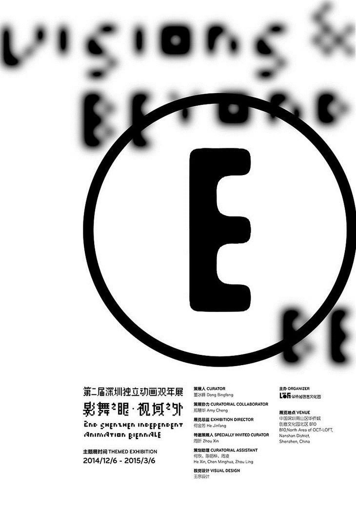 第二届深圳独立动画双年展主题展,计划邀请来自全球10个国家和地区的28位/组、计38名艺术家和导演参加。作品创作时段从1920年代至今横跨近百年,展出作品包括实验动画、纪录片、录像艺术、新媒体、装置、现场幻灯电影表演等,基本涵盖了影像艺术的各种类别和表现形态。“影舞之眼”聚焦活动影像的“现代之眼”,“视域之外”则志在深描一整套的影像机制。观者不仅可以与“独立动画”的美学遭遇、政治以及历史性话题的铺陈,更重要的在于自身经验与作品命题之间思考、行动(现场)的可能。