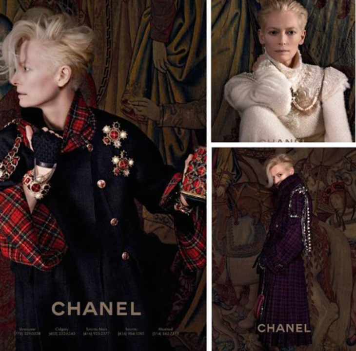 2013年 Tilda Swinton 代言 Chanel 巴黎-爱丁堡系列,广告由 Karl Lagerfeld亲自掌镜,更获得“她不仅是苏格兰人,也是现代女性,永恒高贵的标志”的高度评价。