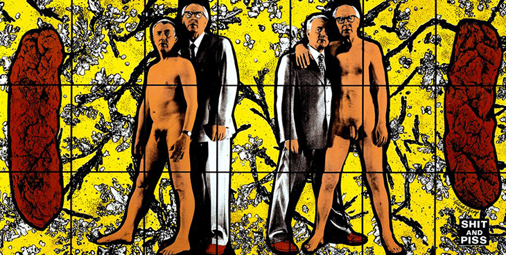 随着时间的推移,这种壁画式的雕塑,被赋予了更加缤纷的颜色,呈现出Andy Warhol式的波普艺术风格。其中最受争议性的,莫过于[裸体粪便图像]系列作品,大胆使用艺术家裸体、粪便、尿液与精液图样,遇到许多卫道人士的批评。但Gilbert&George毕竟不是哗众取宠的艺术家类型,对于他们而言,裸体被视为身体符号,排泄物则是一种最原始死亡,从身体养分分演变成废物的过程。