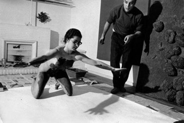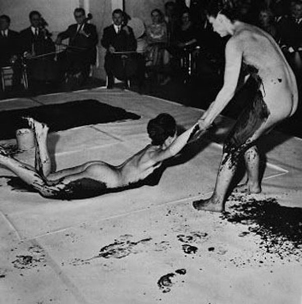 克莱因的创作过程宛若表演,他打着蝴蝶领结,戴着白手套,着装齐整地在这多元的空间里,把行动、表演、展示、绘画、音乐、戏剧等观念,揉作一团,或者说什么都不是。他把这种行为定义为anthropométries作画方式,形成一种带有神秘主义的《人体测量系列》。