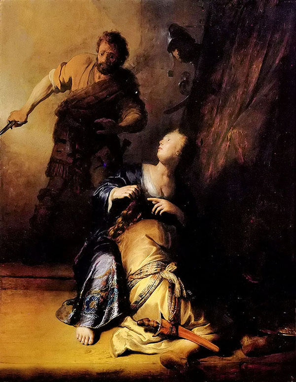 中年时期个人生活的不幸和折磨,晚年的生活艰难,使伦勃朗越来越深刻地去观察和理解社会。他的油画一贯采用“光暗”处理手法,即采用黑褐色或浅橄榄棕色为背景,将光线概括为一束束电筒光似的集中线,着重在画的主要部分。这种视觉效果,就好像画中人物是站在黑色舞台上,一束强光打在他的脸上。
