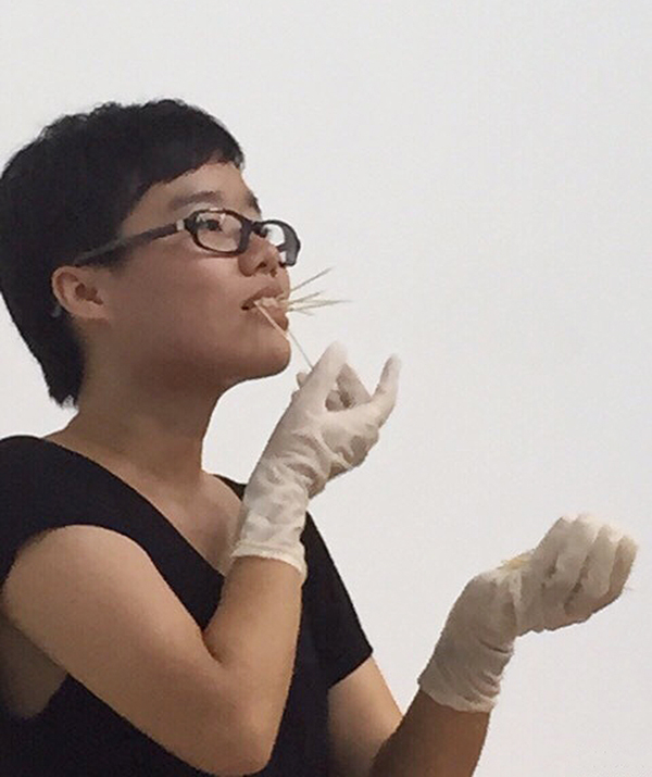 来自香港的刘南茜作品《无题》——嘴里插满牙签后,唱五星红旗的歌。