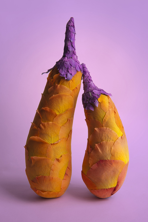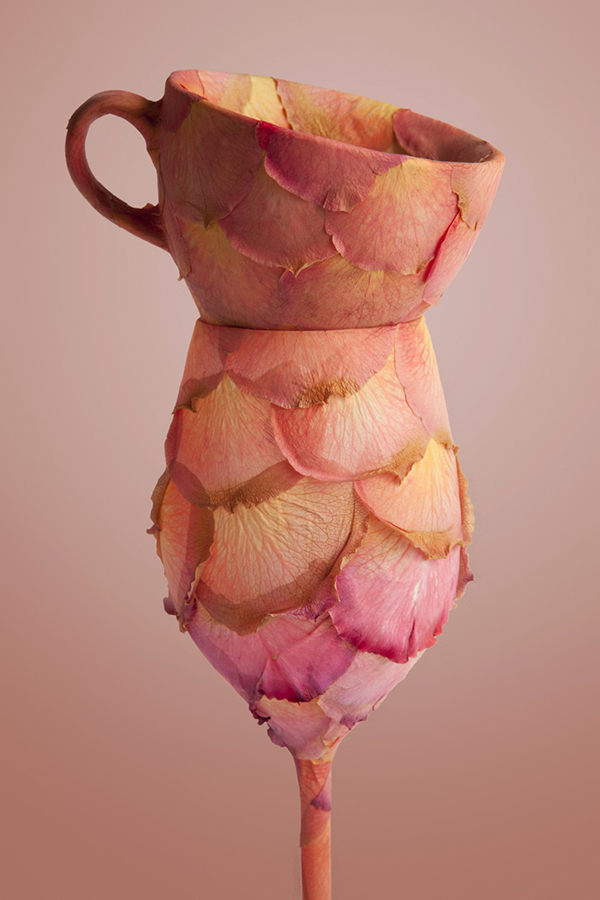 The Netherlands-based designer and artist Xiaoling Huang wrapped daily necessities with fresh flower petals to create unique stilllife photography. In 2014 Xiaoling was able to get many pansies from a greenhouse. She studied the shapes, veins and colours of flower petals on a lightbox, and then selected the appropriate form of the object to cover according to the structure of the petals. The dark radial lines of pansies give a sense of the movement of flowing watercolours. This year she continues to create new objects with a variety of flower petals. She mainly uses roses and hydrangea petals, which are used to wrapped different fruits, vegetables and kitchenware.