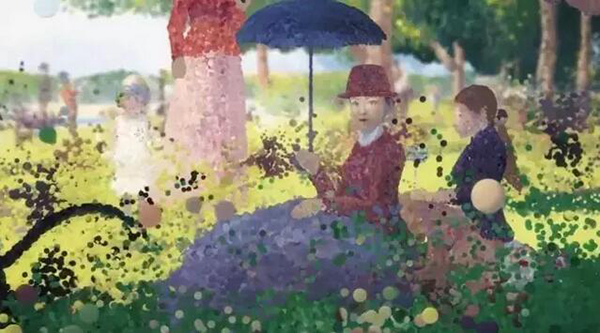 新印象主义的创始人和主要代表修拉(Georges Seurat,1859~1891)1886年展出的一幅最能体现“新印象主义”绘画原理的代表作品。画面描写了人们在塞纳河阿尼埃的大碗岛上休息度假的情景:阳光下的河滨树林间,人们在休憩、散步,垂钓,河面上隐约可见有人在划船,午后的阳光拉下人们长长的身影,画面宁静而和谐。这幅画主要采用了点彩画法。