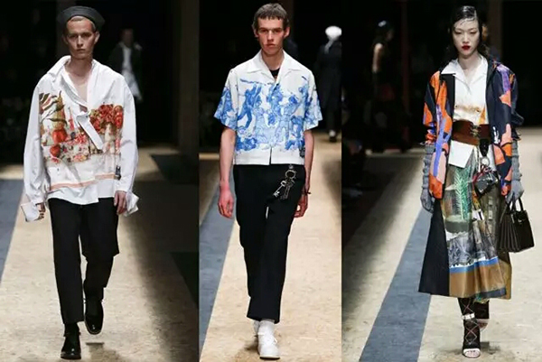 最有代表性的无疑是Prada秀场上的那些男孩与女孩们所穿着的绘画图案衬衫,全部出自法国画家Christophe Chemin之手,这些绘画图案的衬衫已经到处都卖断货。