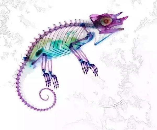 来自日本的艺术家富田伊织(Iori Tomita)利用化学荧光染色的方法,将鱼类、甲虫类、爬虫类及哺乳类动物的尸体透明化,创造了这些 “死亡艺术” 系列作品。他对于“死亡艺术”的特殊痴迷和将化学药剂与艺术结合的做法,让海洋生物美妙的骨骼结构摇身一变成为美妙的艺术作品。