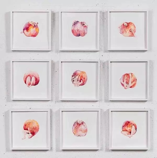 是桃子 还是人心?鲜红的桃子乍看与人心别无二样。九幅图中的桃子形态各异,长出手脚自拥自抱,不愧是心思细腻的艺术家,一下子就把人心纠结与苦恼用画笔描绘出来,摩登大咖拜服!