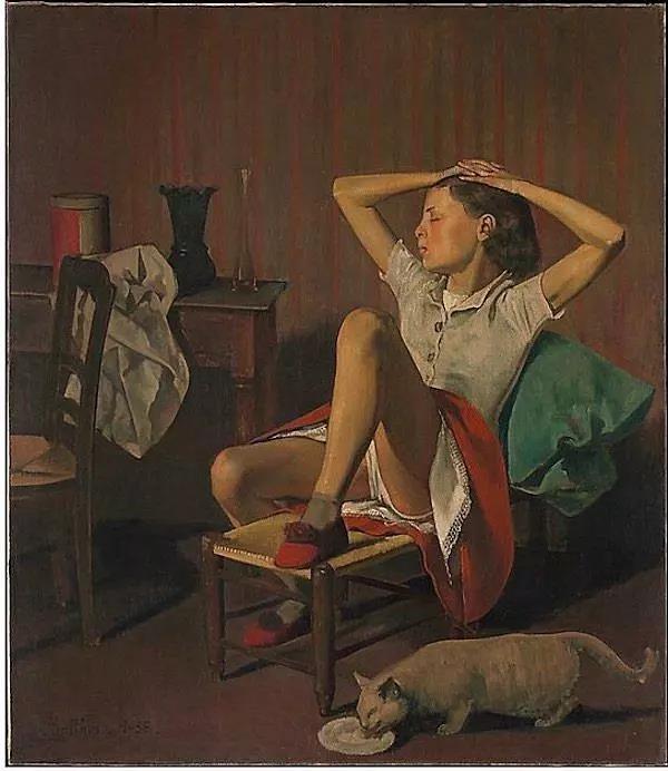 这件作品的作者是巴尔蒂斯(Balthus),20世纪卓越的具象绘画大师。在《瑟蕾莎之梦》中,他描绘的主角是邻居瑟雷莎·布兰查德,当时她大概12-13岁。