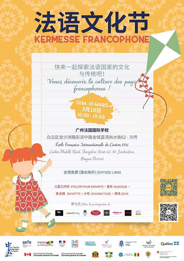 华南地区的第一场法语文化节活动将会在三月初举行。 届时观众将有机会通过各种各样的活动,诸如各种游戏,品尝法语国家特色菜肴等方式来分享这个美好时刻。