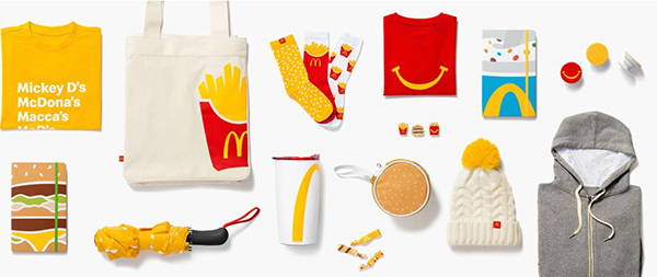 而在具体设计方面,麦当劳也融入了关于麦当劳汉堡、薯条、汉堡表层的芝麻粒、麦当劳开心乐园餐的经典微笑元素,也就有了我们所看到的汉堡伞、麦当劳冬季毛线帽、芝麻元素袜子、巨无霸和麦旋风元素的笔记本、麦当劳logo图案杯子等。