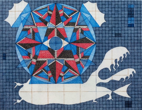 在古埃及传说中,“荷鲁斯之眼”最早是代表太阳的神明沃婕特的眼睛,意为无所不见、能察知世间万物的神圣之眼。其具有护身和辟邪力量的情感寄托激发李文光开始了对“三角结构”和“圆”这些隐喻神力的图形的运用及其拟物化的创作,他以独有的图像逻辑进行推理,使得那些紧密勾绘的具有象征性的几何图形元素,在无限延伸的网格之上重组、衍生、拓展,使画面具有了生命,泛动着涟漪,质朴而绚丽。