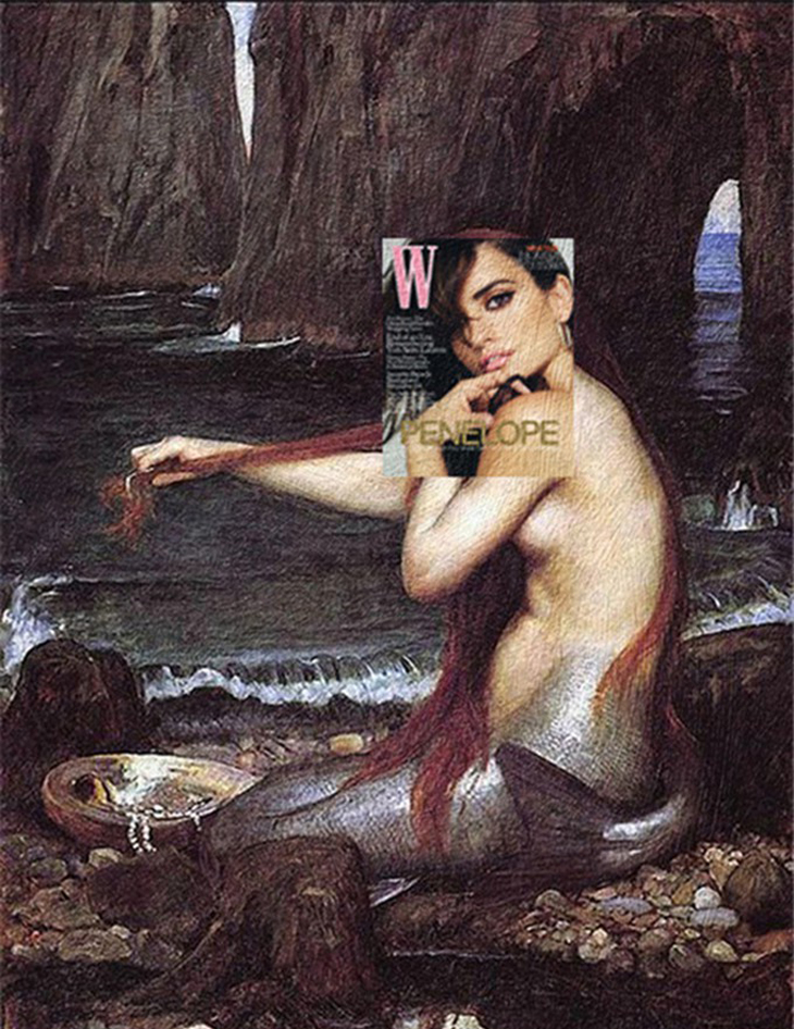 佩内洛普·克鲁兹(Penelope Cruz)为时尚杂志《W》2008年8月刊拍摄的封面照 + 英国画家约翰·威廉姆·沃特豪斯(John William Waterhouse)的作品《美人鱼》 (A Mermaid)